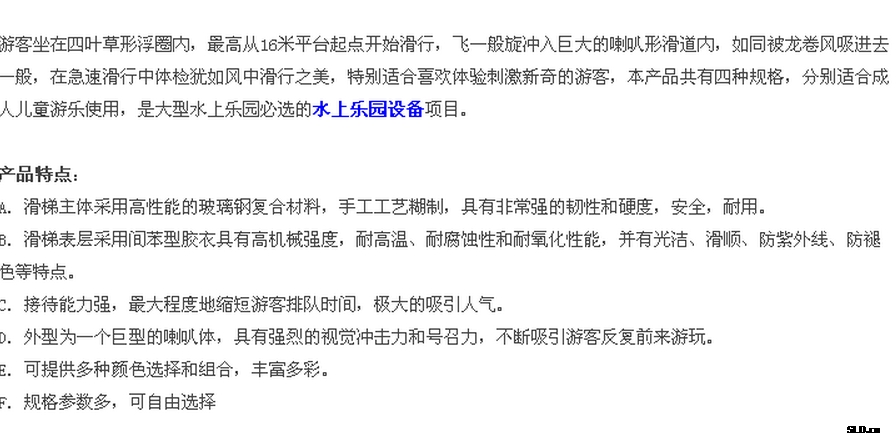 水上樂園設(shè)施您當前的位置:網(wǎng)站首頁 > 產(chǎn)品展示 > 水上樂園設(shè)備 > 水上樂園設(shè)施>大喇叭滑梯